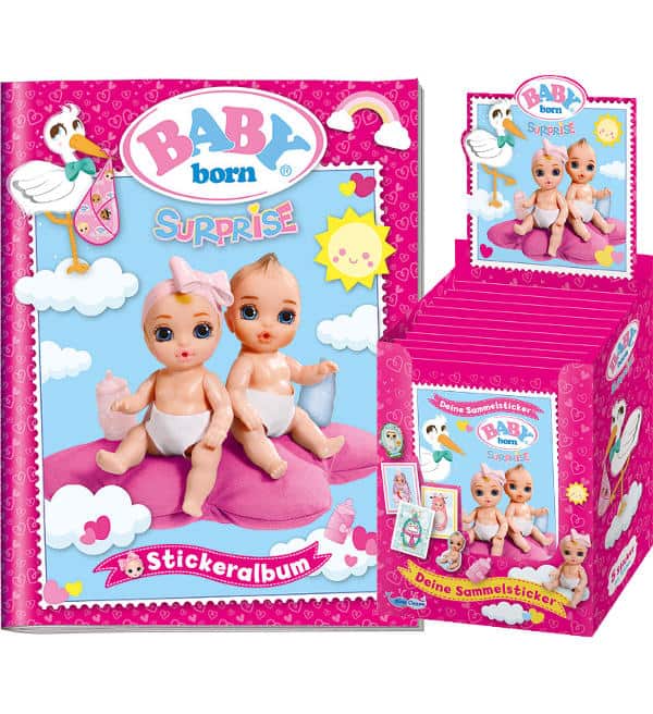 Álbum vacío + 1 caja de 50 sobres de la colección de cromos Baby Born Surprise. Cada sobre contiene 5 cromos.