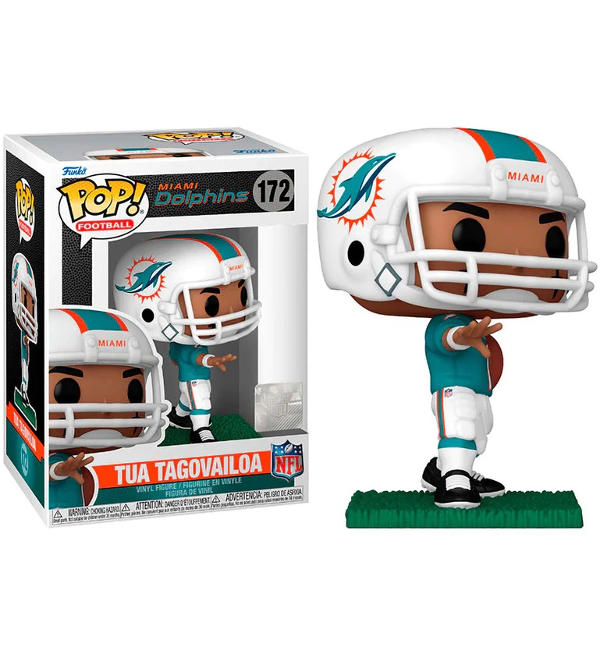 Funko POP! "Football 172 NFL - Tua Tagovailoa Miami Dolphins". La figura de vinilo mide aproximadamente 9 cm de alto y viene en una caja con ventana.