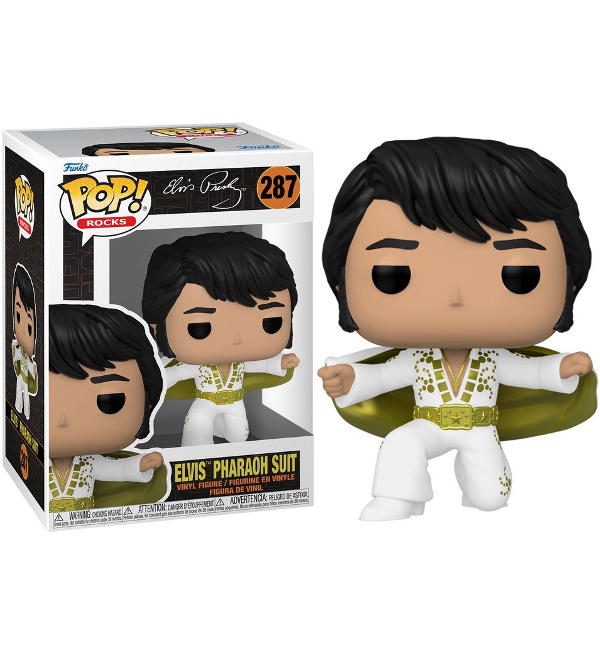 Funko POP! "Rocks 287 Elvis - Pharaoh Suit". La figura de vinilo mide aproximadamente 9 cm de alto y viene en una caja con ventana.
