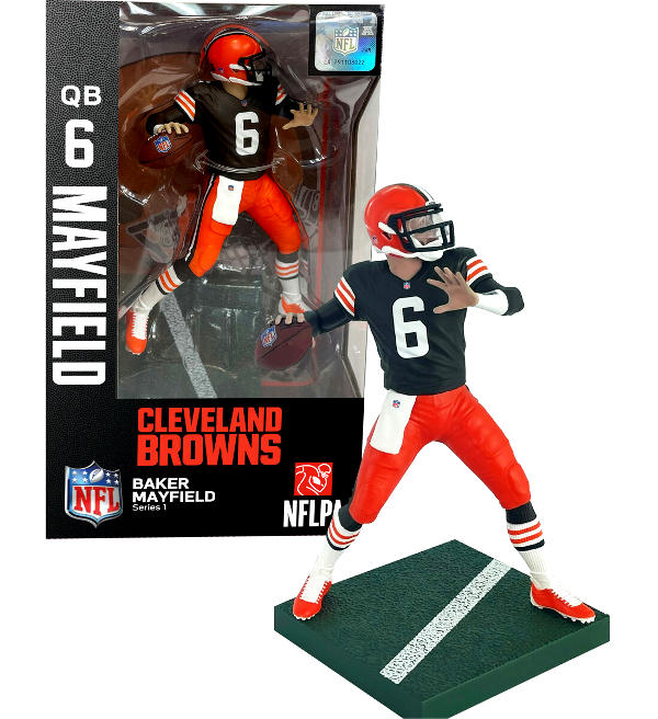 Figura deportiva de Imports Dragon NFL Series 1 "Baker Mayfield (Cleveland Browns)". La figura mide aproximadamente 15 cm de alto y está hecha de plástico.