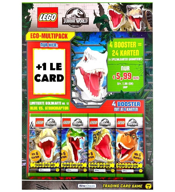 Eco-Multipack Lego Jurassic World Serie 3 con 4 sobres (=24 cartas) más 1 carta dorada limitada. Cada Eco-Multipack contiene una de las siguientes 4 cartas de oro limitadas.
