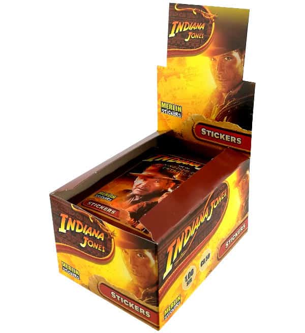 Caja de 50 sobres de la colección de cromos "Merlin Indiana Jones". Cada sobre contiene 5 cromos.