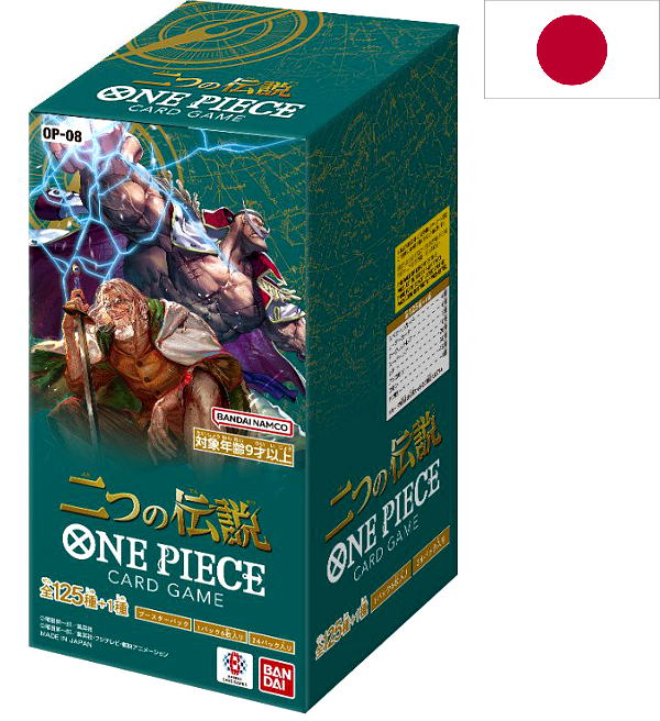 Caja de 24 sobres (Versión japonesa) de la colección "One Piece Card Game - Two Legends OP-08". Cada sobre contiene 6 cartas, lo que hace un total de 144 cartas por caja.