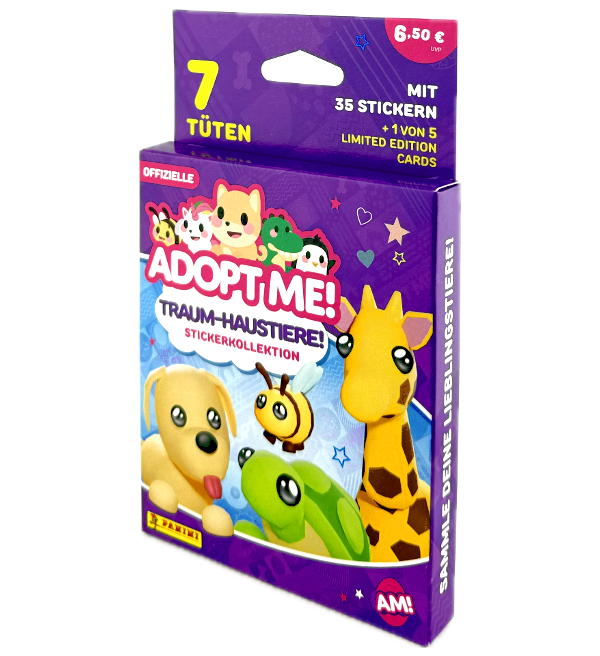 Eco-Blister (=7 sobres + 1 Limited Edition Card) de la colección de cromos "Panini Adopt Me Dream Pets". Cada sobre contiene 5 cromos.