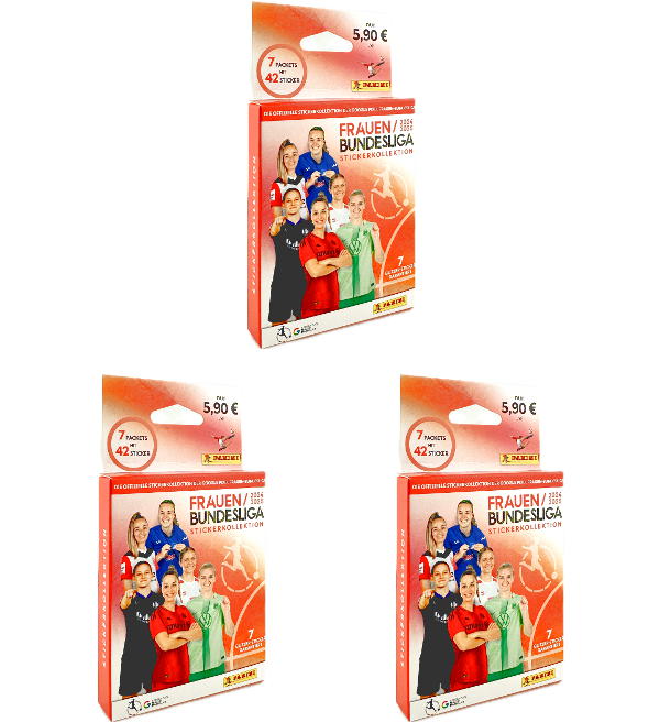 3 x Eco-Blister (=21 sobres) de la colección de cromos "Panini Bundesliga Femenina 2024-2025". Cada sobre contiene 6 cromos.