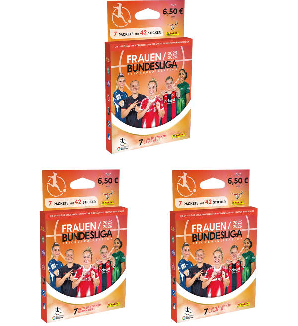 3 x Eco-Blister (=21 sobres) de la colección de cromos "Panini Bundesliga Femenina 2025-2026". Cada sobre contiene 6 cromos.