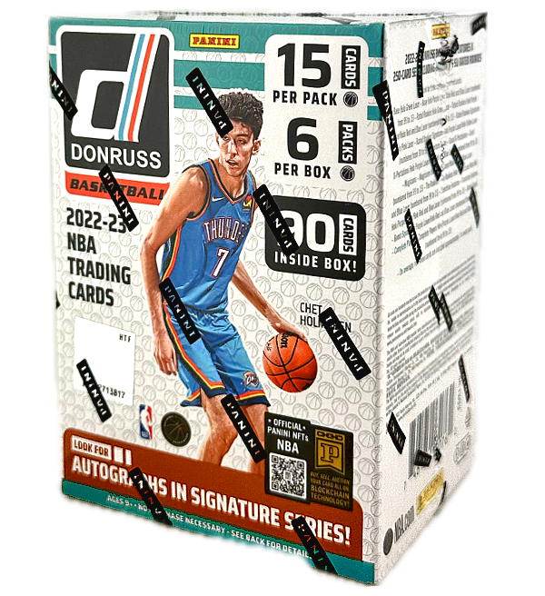 Blaster Box de 6 sobres de la colección "Panini Donruss Basketball NBA 2022/23" Trading Cards. Cada sobre contiene 15 cartas, lo que hace un total de 90 cartas por caja.