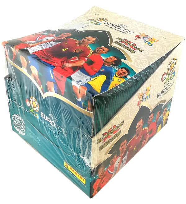 Caja de 100 sobres de la serie de cartas coleccionables Panini EURO 2012 Adrenalyn XL. Cada sobre contiene 6 cartas, lo que hace un total de 600 cartas por caja.