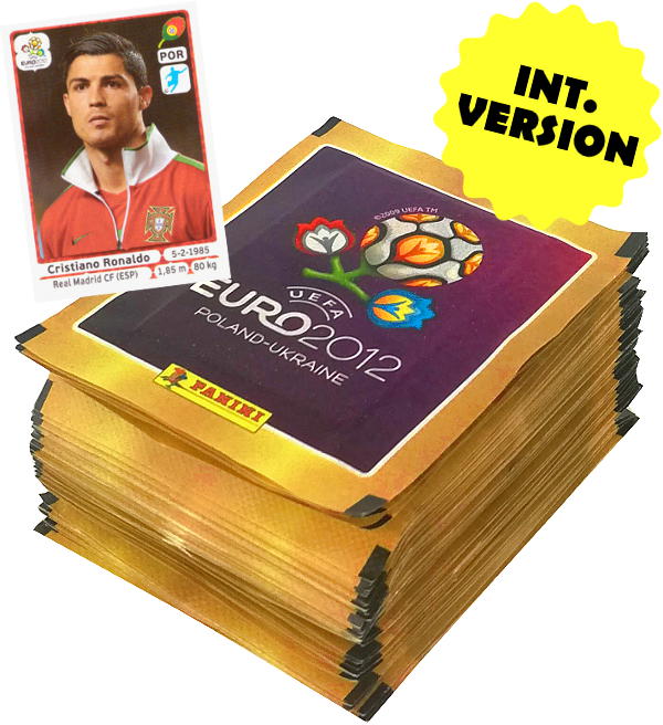 50 sobres con un total de 250 cromos de la colección Panini EURO 2012. Esta es la versión internacional. Las pegatinas de los jugadores tienen un borde blanco.