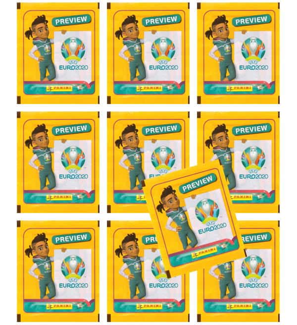 10 sobres (versión internacional) de la colección de cromos Panini EURO 2020 Preview. Cada sobre contiene 5 cromos.