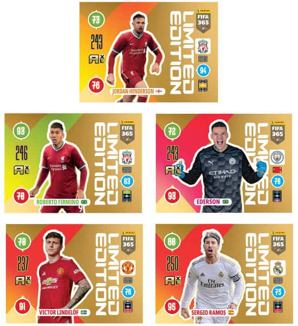 Las 10 Blister Panini FIFA 365 2021 Adrenalyn XL diferentes. En total, obtienes 50 sobres (=300 cartas) más todas estas 10 Limited Edition Cards: