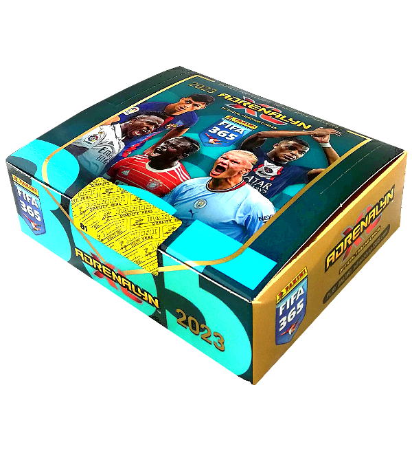 Caja de 24 sobres de la colección "Panini FIFA 365 2023 Adrenalyn XL" Trading Cards. Cada sobre contiene 6 cartas, lo que hace un total de 144 cartas por caja.