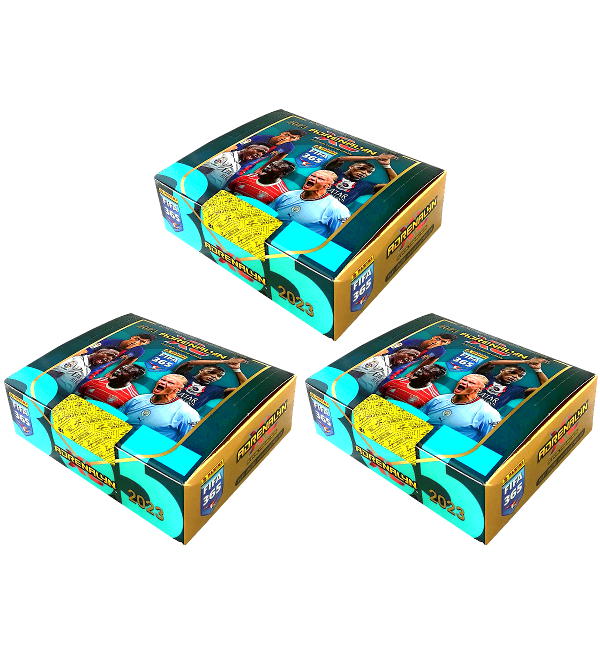3 cajas (=72 sobres) de la colección "Panini FIFA 365 2023 Adrenalyn XL" Trading Cards. Cada sobre contiene 6 cartas, lo que hace un total de 432 cartas.
