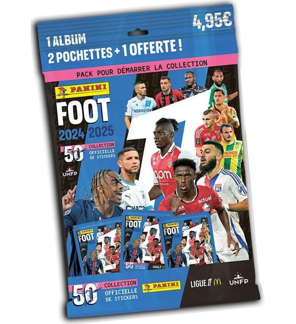 Starter Pack de la colección de cromos "Panini Foot 2025 Ligue 1". Cada sobre contiene 5 cromos.