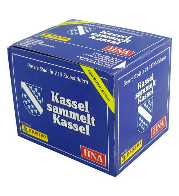Caja con 50 paquetes de la colección de cromos Panini Kassel sammelt Kassel. Cada paquete contiene 5 cromos, por lo que hay 250 cromos en total en esta caja originalmente precintada.