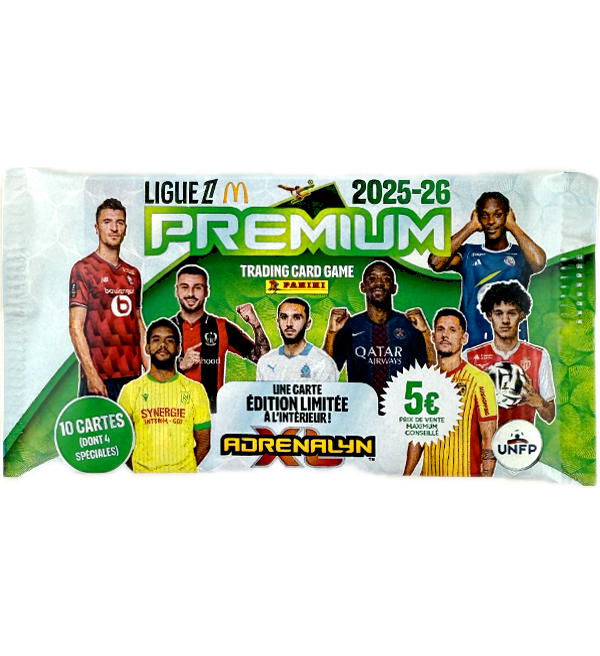 Premium Booster Pack de la colección "Panini Ligue 1 Adrenalyn XL 2025-26" Trading Cards. Cada sobre contiene 10 cartas (1 Limited Edition Card, 4 Special Cards, 5 Base Cards).