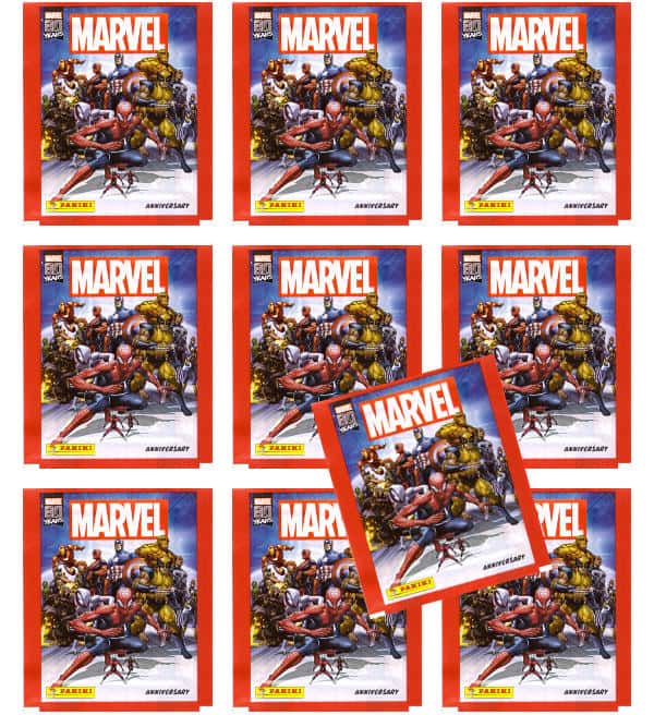 10 sobres de la colección de cromos y cards Panini Marvel 80 Años. Cada sobre contiene 4 cromos + 1 tarjeta.