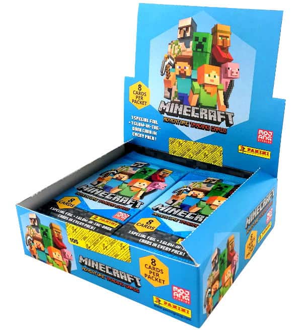 Caja de 18 sobres de la serie de cartas coleccionables Panini Minecraft Trading Cards. Cada sobre contiene 8 cartas, lo que hace un total de 144 cartas por caja.