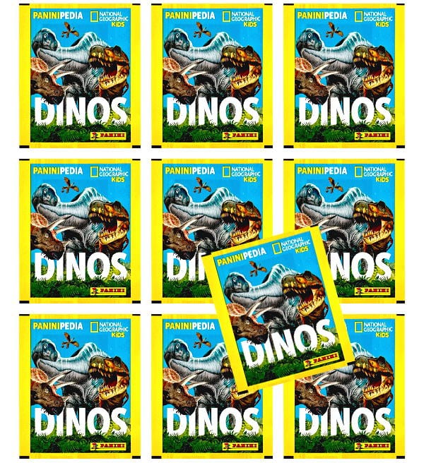 10 sobres de la colección de cromos "Panini Paninipedia Dinos". Cada sobre contiene 5 cromos.