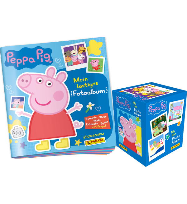 Álbum (Version Alemana) + caja de 36 sobres de la colección de cromos y cards "Panini Peppa Pig - My Fun Photo Album". Cada sobre contiene 4 cromos + 1 tarjeta.