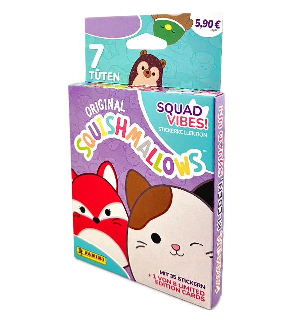 Eco-Blister (=7 sobres + 1 Limited Edition Card) de la colección de cromos "Panini Squishmallows Squad Vibes". Cada sobre contiene 5 cromos.