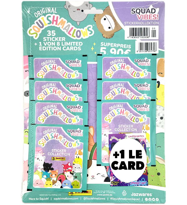 Multipack (=7 sobres + 1 Limited Edition Card) de la colección de cromos "Panini Squishmallows Squad Vibes". Cada sobre contiene 5 cromos.