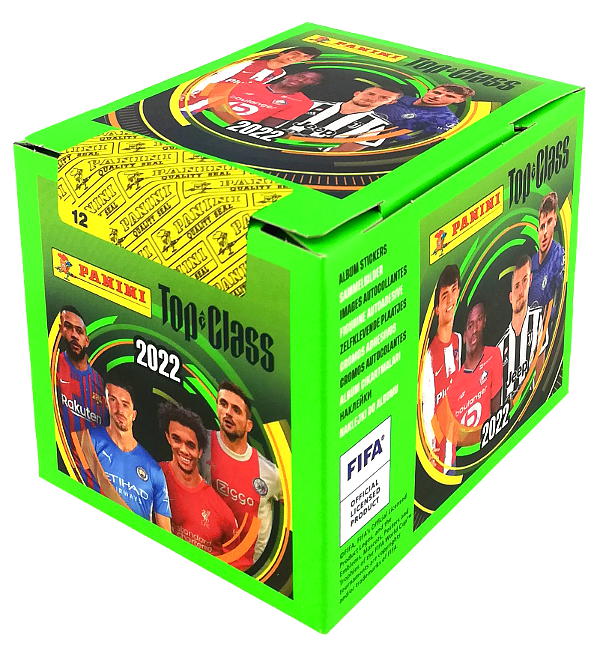 Caja de 36 sobres de la colección de cromos "Panini Top Class 2022". Cada sobre contiene 5 cromos.