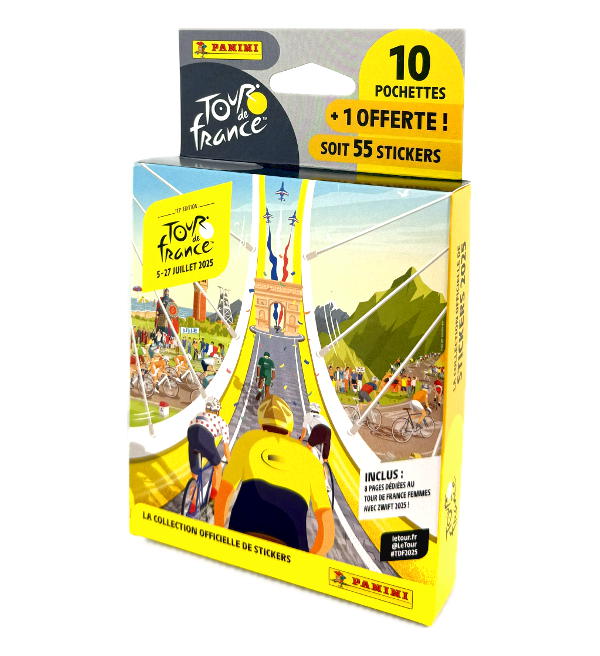 Eco-Blister de 11 sobres de la colección de cromos "Panini Tour de France 2025". Cada sobre contiene 5 cromos.