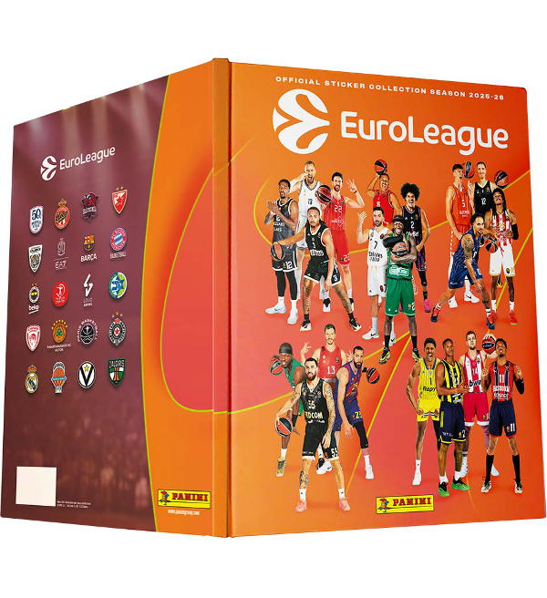 Álbum de tapa dura (Hardcover Album) para la colección de cromos "Panini Turkish Airlines EuroLeague 2025-26" con 56 páginas y espacio para 448 cromos.