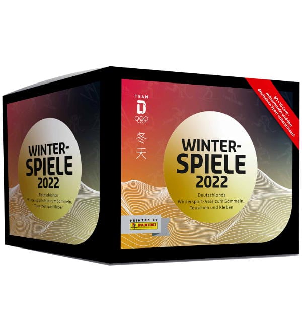 Caja de 50 sobres de la colección de cromos "Panini Winterspiele 2022". Cada sobre contiene 5 cromos.
