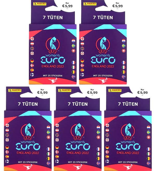 5 x Blister (=35 sobres) de la colección de cromos "Panini Women's Euro 2022". Cada sobre contiene 5 cromos.