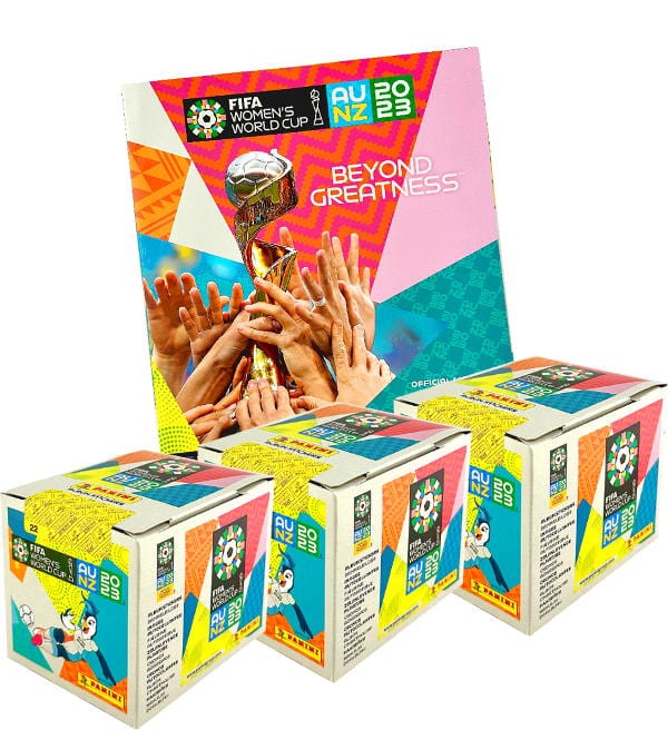 Álbum + 3 cajas (=108 sobres) de la colección de cromos "Panini Womens World Cup 2023". Cada sobre contiene 5 cromos.