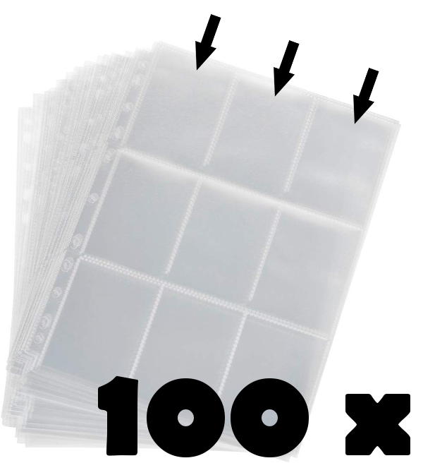100 "9-Pocket Pages Top Loading" de alta calidad con 11 hoyos para el almacenamiento seguro de sus cromos. Las "9-Pocket Pages" son adecuadas para todas las cartas estándar como Pokémon, Yu-Gi-Oh, Magic, etc.