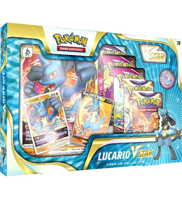Colección "Lucario V-Star Premium-Kollektion" (alemán) del juego de cartas coleccionables Pokémon.