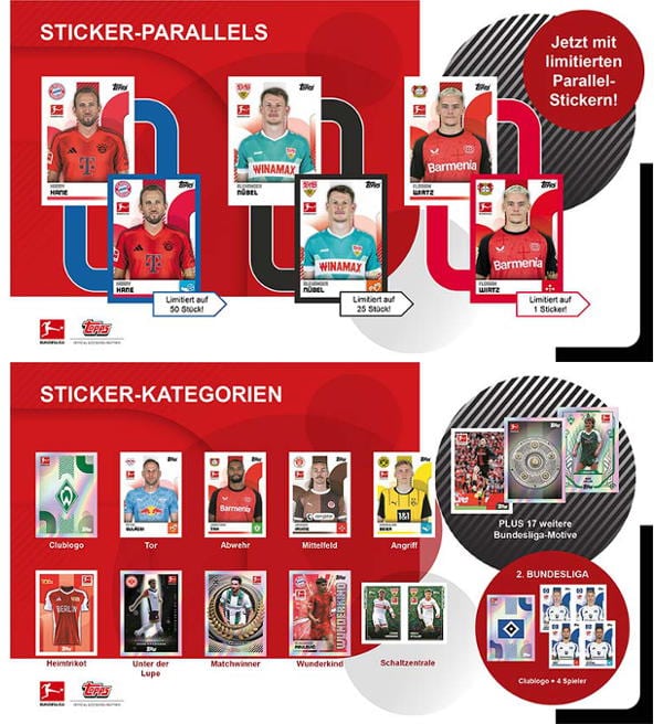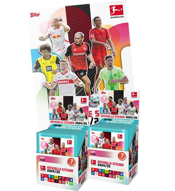 Álbum + 2 cajas (=100 sobres) de la colección de cromos Topps Bundesliga 2024/2025. Cada sobre contiene 7 cromos.