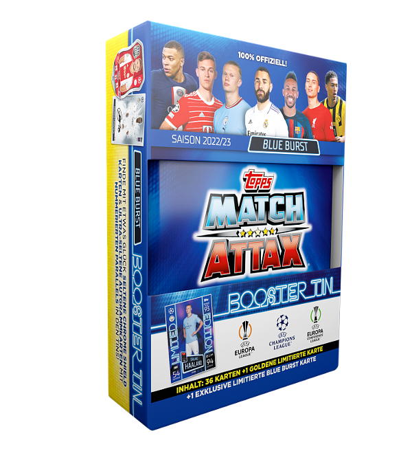 Booster Tin "Blue Burst" de la colección "Topps Champions League Match Attax 2022/23 Trading Cards". Cada Mini Tin contiene 36 tarjetas + 1 Limited Edition Gold Card + 1 tarjeta Limited Edition NEON BOOSTER.