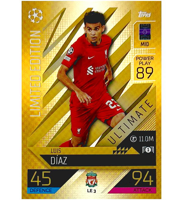 Gold Limited Edition Card LE3 Luis Diaz (FC Liverpool) de la colección Topps Champions League Match Attax EXTRA 2022/23 Trading Cards.