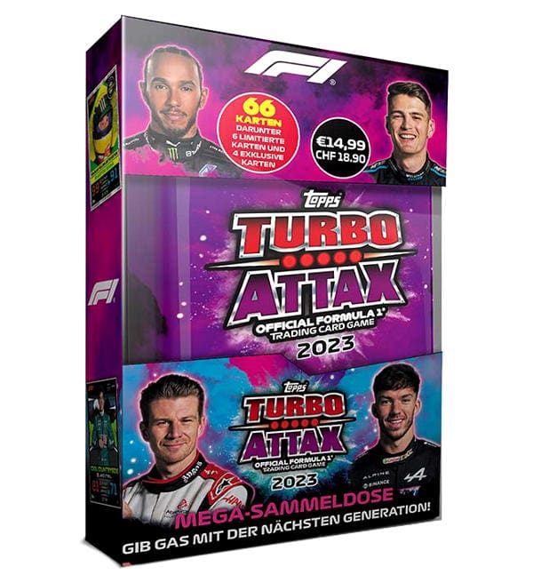 Mega-Tin "Purple" de la colección Topps Formula 1 Turbo Attax 2023 Trading Cards que incluye: