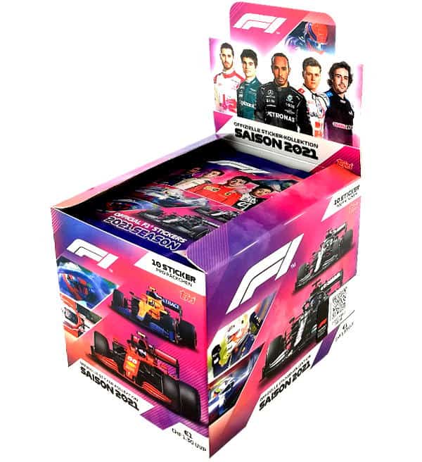 Caja de 50 sobres de la colección de cromos Topps Formula 1 F1 2021. Cada sobre contiene 10 cromos.