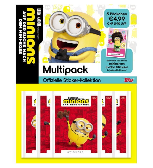 Multipack V1 de 5 sobres + 1 Jumbo Sticker de la colección de cromos Topps Minions - The Rise of Gru 2022. Cada sobre contiene 6 cromos.